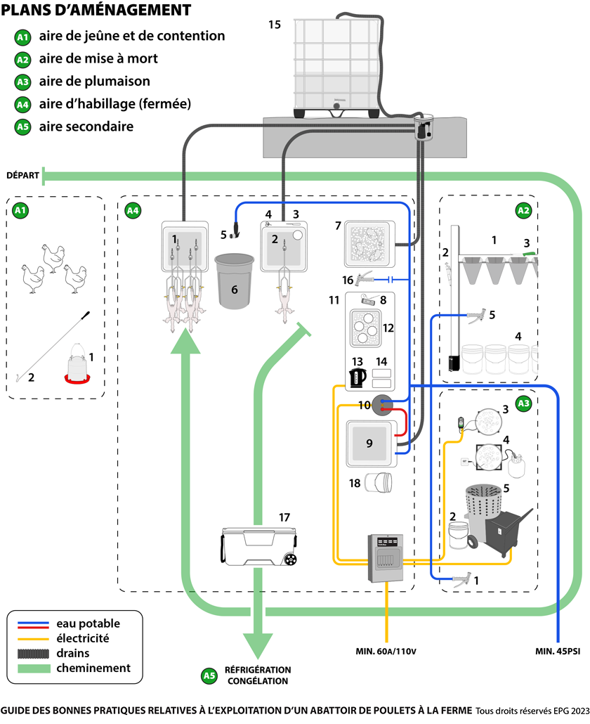 - Apporter la glacière de transport (A4) et la petite glacière à abattis (A4) dans l’aire secondaire (A5) et transférer les poulets et les abattis dans une unité de réfrigération;