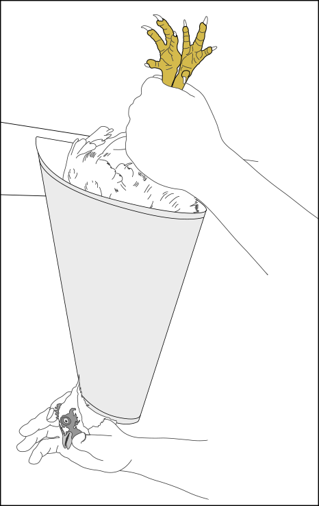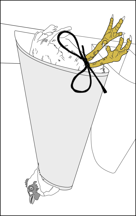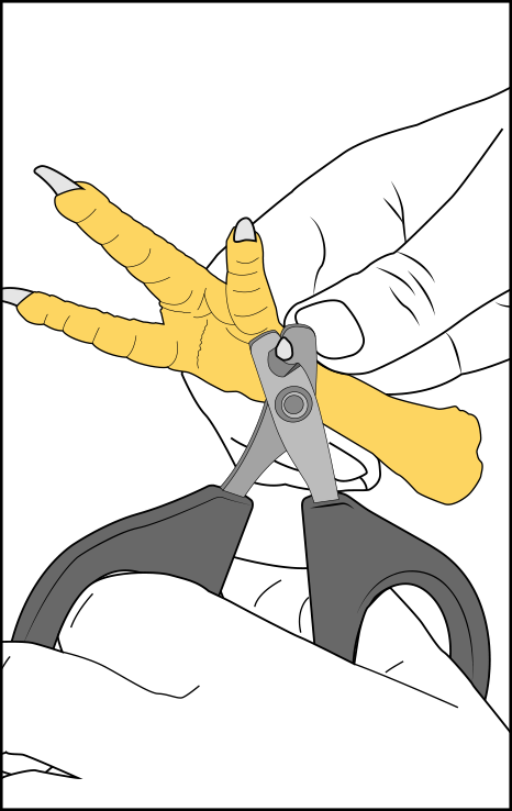 - Une fois les deux pattes sectionnées, utilisez le coupe-griffe pour couper les griffes de l’oiseau (ill.3). Ceci vous permettra d’ensacher les pattes sans qu’elles ne risquent de déchirer le sac. Déposer les pattes dans le contenant prévu à cet effet dans la petite glacière prévue pour l’entreposage des abattis.