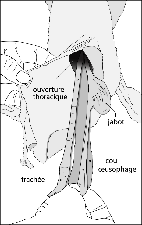 - En fouillant un peu autour du cou, repérez et puis dégagez l’œsophage et la trachée (ill.4). La trachée (par laquelle l’oiseau respire) est le plus coriace des deux tubes, elle est nervurée et presque rigide. L’œsophage (par lequel l’oiseau ingère sa nourriture) est souple et lisse. Suivez-le jusqu’à la base du cou où vous trouverez le jabot qui se présente sous la forme d’un renflement de l’œsophage. Le jabot n’est pas facile à dénicher, surtout lorsqu’il est vide, ce qui sera le cas si vous avez bien fait jeûner votre volaille. Collé sur la poitrine, c’est un petit sac aplati de la taille d’une prune. Décollez-le complètement de la poitrine, sans craindre de le déchirer, l’appareil est solide. Une fois la trachée, l’œsophage et son jabot bien détachés, l’ouverture thoracique par laquelle ces trois organes devront éventuellement cheminer, vers l’intérieur du poulet, devrait être bien visible à la base du cou.