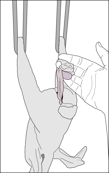 - Tirez délicatement sur le cloaque et extrayez de la cavité pelvienne une section d’intestin suffisamment longue pour que le cloaque puisse pendre sur le côté (ill.5 et 6).