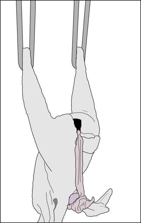 Retirez alors les viscères de la cavité et suspendez-les au-dessus du bac de récupération des viandes non-comestibles.