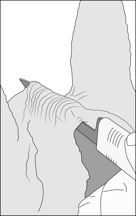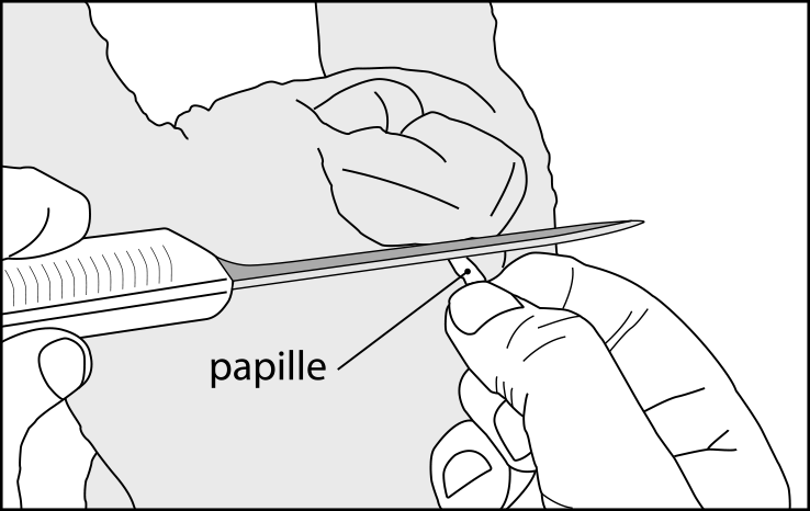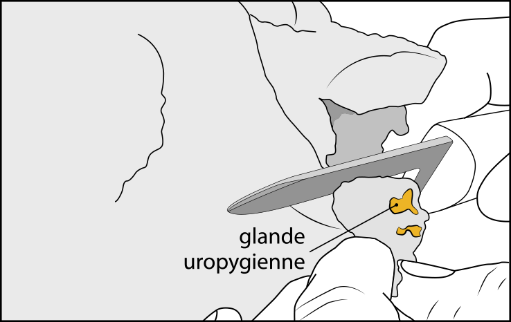 - Faite pivoter l'oiseau pour qu’il vous fasse dos puis, d’une main, pincez la papille de la glande uropygienne entre le bout du pouce et de l’index (ou à l’aide d’une petite paire de pinces) (ill.1) et, de l’autre, faites une coupe profonde avec le couteau en rasant l’os du croupion (le pygostyle) jusqu’à sa base (ill.2);