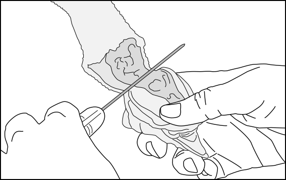 - Élargissez horizontalement l’ouverture ainsi pratiquée de manière à pouvoir faire pénétrer votre index sous la bourse puis derrière l’intestin (ill.3);