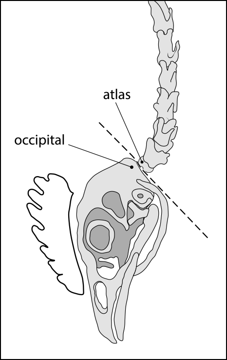 Pour trancher la tête sans mordre d’os et émousser votre couteau, tournez la volaille vers vous et cassez son cou en faisant pivoter la tête loin vers l’arrière (ill.1). En rompant ainsi la jonction entre la base du crâne (l’occipital) et la première vertèbre cervicale (l’atlas), il vous sera aisé d’y faire ensuite passer la lame de votre couteau (ill.2). Maintenez la tête bien pliée vers l’arrière pendant la manœuvre. Jeter la tête dans le bac de récupération des viandes non-comestibles.
