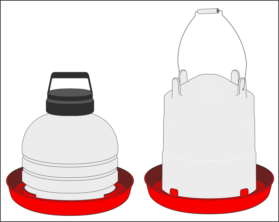 Au maximum 24 heures et au minimum 16 heures avant l’abattage, les oiseaux qui seront abattus sont transférés dans un enclos sur litière non-comestible (cailloux, paille, copeaux de bois) pour le jeûne. Cet enclos doit pouvoir protéger les oiseaux du soleil et de la pluie et disposer d’un abreuvoir automatique (1). Un capteur de volaille (2) permet l’attrapage sécuritaire et efficace des poulets dans l’enclos. Cette aire, sans être complètement fermée, peut être couverte d’un abri-soleil 10pi x 10pi ou être située sous le débord de toit d'une structure fermée.