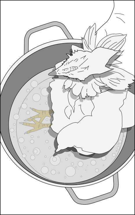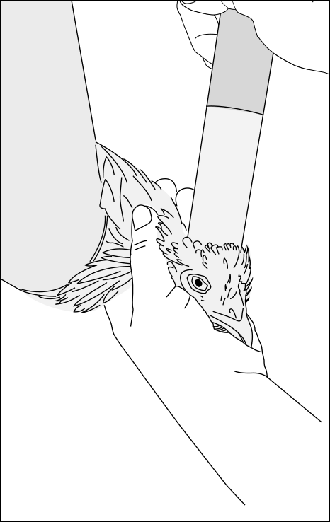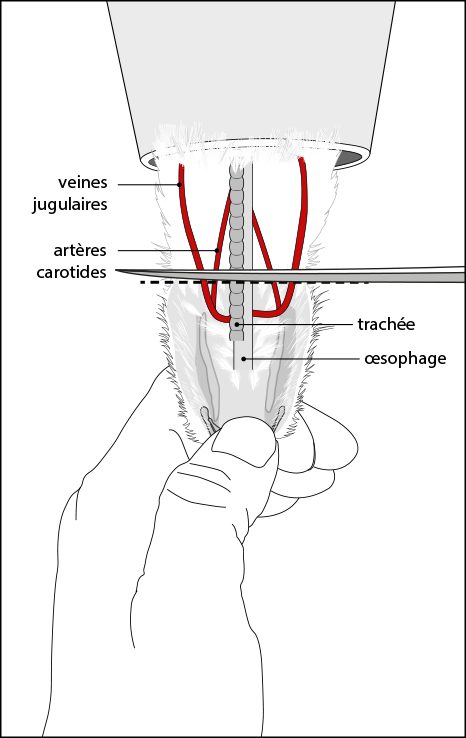 Pour trancher la tête sans mordre d’os et émousser votre couteau, tournez la volaille vers vous et cassez son cou en faisant pivoter la tête loin vers l’arrière (ill.1). En rompant ainsi la jonction entre la base du crâne (l’occipital) et la première vertèbre cervicale (l’atlas), il vous sera aisé d’y faire ensuite passer la lame de votre couteau (ill.2). Maintenez la tête bien pliée vers l’arrière pendant la manœuvre. Jeter la tête dans le bac de récupération des viandes non-comestibles.