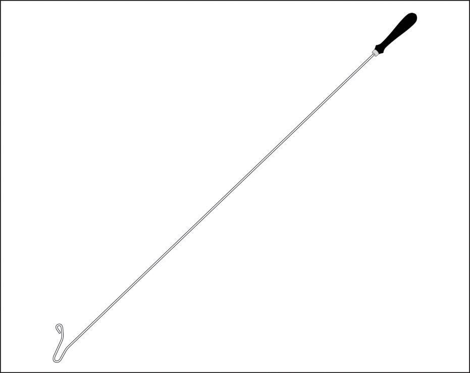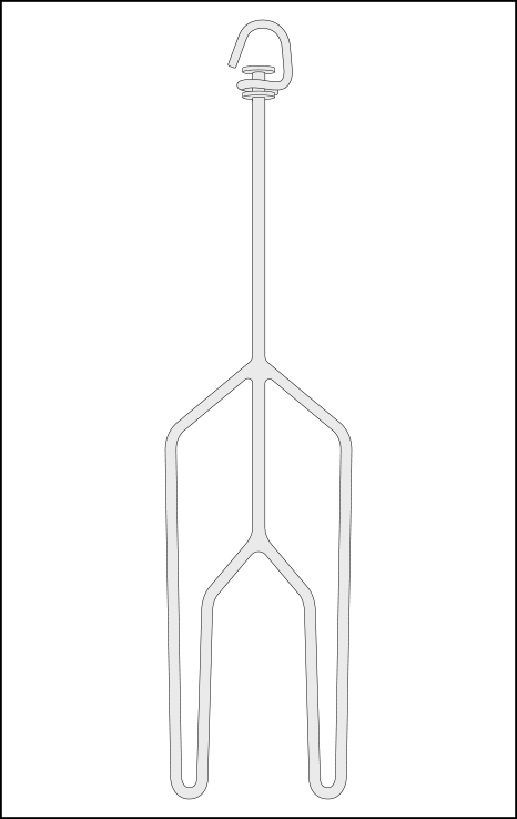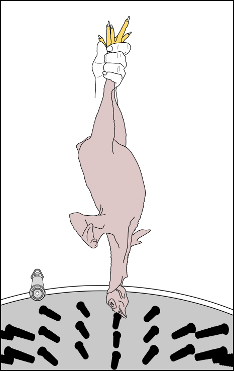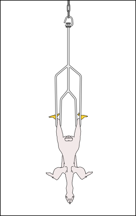 - Faites pivoter le crochet de 90° de sorte à pouvoir saisir d’une main une des deux pattes du poulet et, de l’autre, la sectionner au niveau de l’articulation tarsienne (ill.1 et 2) à l'aide de votre couteau d’éviscération. Répétez l’opération sur l’autre patte. Rincer la carcasse et les pattes;