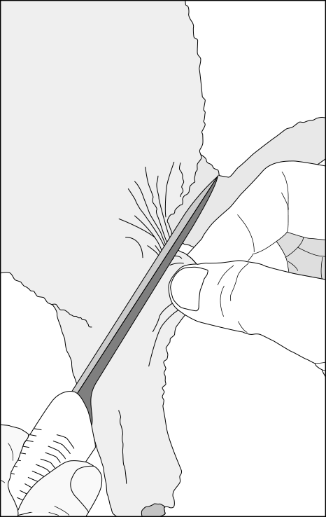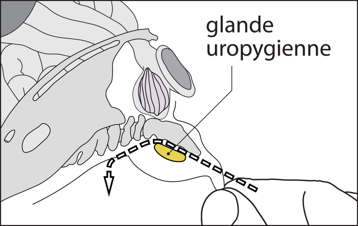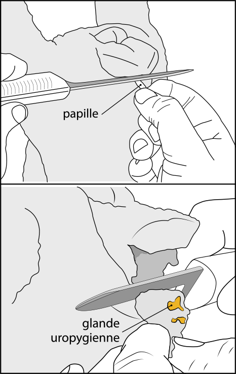 - Faite pivoter l'oiseau pour qu’il vous fasse dos puis, d’une main, pincez la papille de la glande uropygienne entre le bout du pouce et de l’index (ou à l’aide d’une petite paire de pinces) (ill.1) et, de l’autre, faites une coupe profonde avec le couteau en rasant l’os du croupion (le pygostyle) jusqu’à sa base (ill.2);
