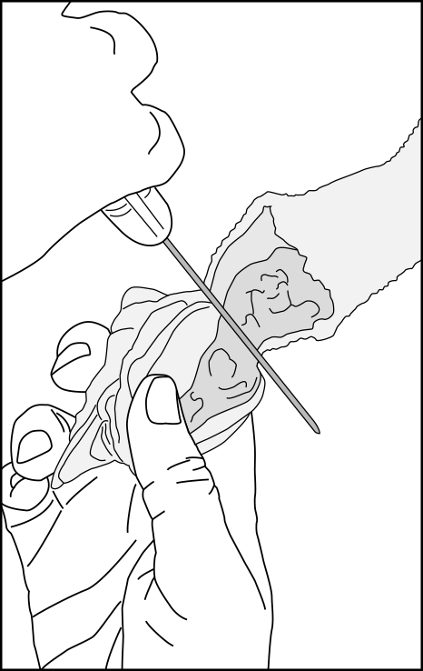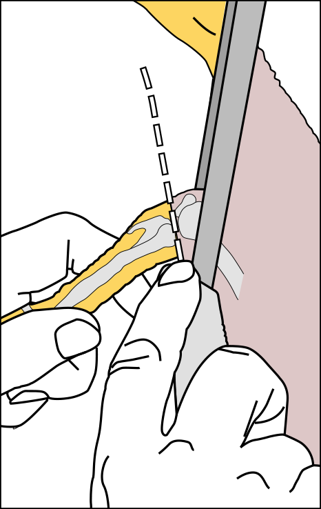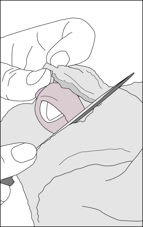 - Élargissez horizontalement l’ouverture ainsi pratiquée de manière à pouvoir faire pénétrer votre index sous la bourse puis derrière l’intestin (ill.3);
