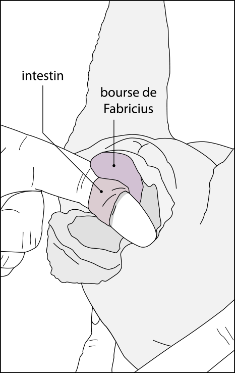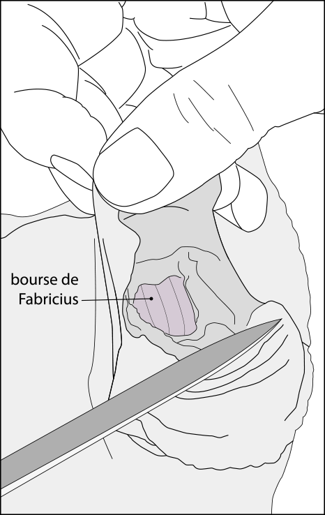 - Pratiquez des incisions peu profondes et répétées à la base du croupion jusqu’au ce que vous découvriez la bourse de Fabricius (ill.2);