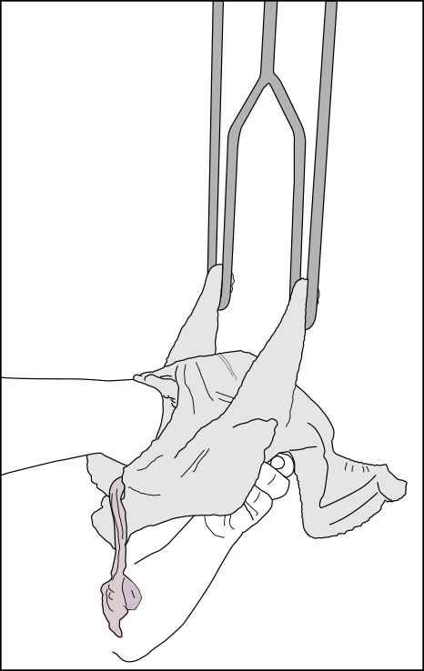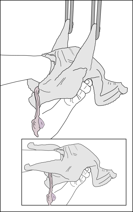 Il est possible de procéder à cette étape de deux façons : en laissant l’oiseau suspendu sur le crochet ou en l'en décrochant (ill.1). Lorsque l’oiseau est petit ou que vos mains sont de bonne taille, l’éviscération en suspension est plus ardue puisque les cuisses de l’animal sont maintenues en place par le crochet et la cavité pelvienne est plus étroite. En prenant l’oiseau dans vos mains, poitrine en l’air, la cavité pelvienne laisse pénétrer la main beaucoup plus facilement. Il faudra tout simplement raccrocher le poulet une fois les viscères extraits. Il ne faut jamais le déposer au fond du lavabo.
