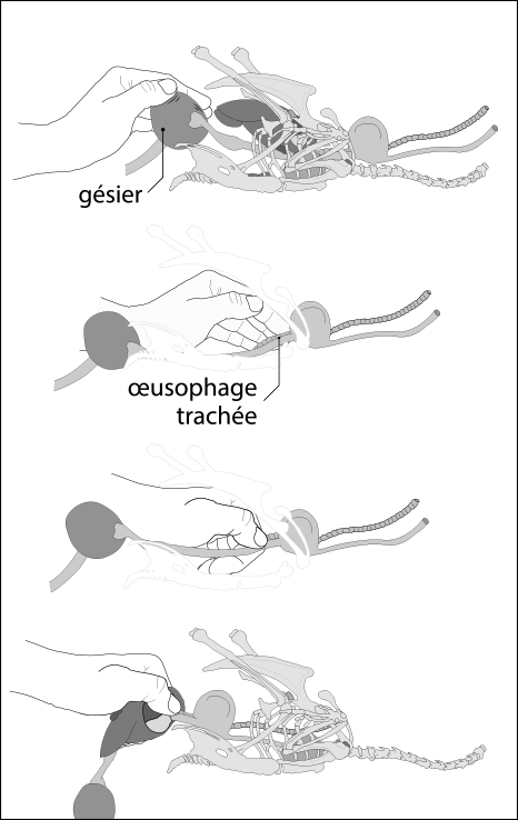 Tirez d’abord sur le gésier pour dégager assez d’espace intérieur pour pouvoir faire pénétrer votre main au complet dans la cavité pelvienne. Formez ensuite une coupelle avec votre main et introduisez-la jusqu’au fond du thorax, dépassant le cœur. En tentant de ne pas trop refermer votre main, ce qui pourrait broyer le foie du poulet, pincez fermement entre votre pouce et votre index l’œsophage et la trachée que vous devriez sentir là (ill.2)