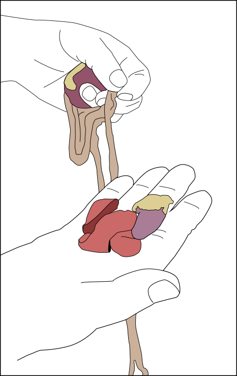 - Tirez délicatement sur le cloaque et extrayez de la cavité pelvienne une section d’intestin suffisamment longue pour que le cloaque puisse pendre sur le côté (ill.5 et 6).