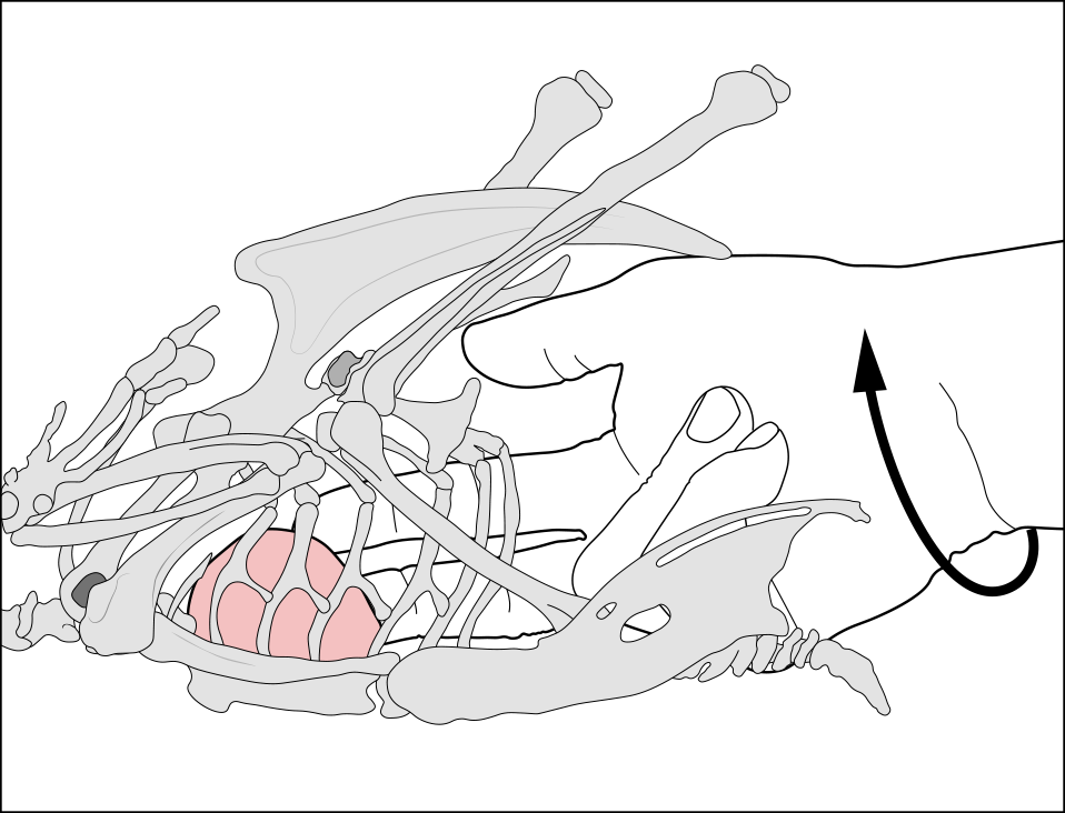 Faites pénétrer la lame par l’ouverture cloaquale et faites-la ressortir vis-à-vis de la pointe du bréchet (sternum). Tranchez ensuite vers le haut pour ouvrir complètement la cavité pelvienne.