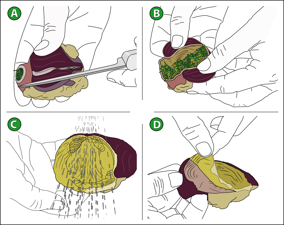 Installé au-dessus du bac de récupération des viandes non-comestibles, tranchez le gésier jusqu’au centre (A) puis ouvrez-le comme un livre pour en exposer l’intérieur (B). Il sera rempli uniquement de gravier si l’animal a bien jeûné, lequel sera mêlé d’herbes et/ou de grains dans le cas contraire. Retournez le gésier à l’envers pour le vider puis, installé maintenant au-dessus du lavabo d’éviscération, rincer l’intérieur profusément, non seulement pour le nettoyer mais aussi pour refroidir la peau jaunâtre qui recouvre l’intérieur de l’organe (C). Bien refroidie, cette membrane sera facile à peler et à jeter (D). Déposez le gésier dans la petite glacière à abattis.