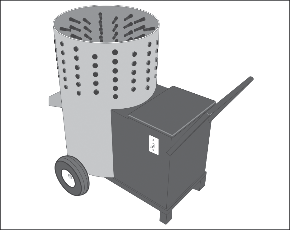 - Une cuve à lessive sur pattes au-dessus de laquelle il est possible d'installer un crochet de suspension permettant l’éviscération en suspension d’une carcasse. C'est la cuve de travail. Au fond de la cuve, il y a un petit récpient où entreposer le gésier du poulet avant son parage. Le poulet ne doit jamais être déposé au fond de cette cuve (2);