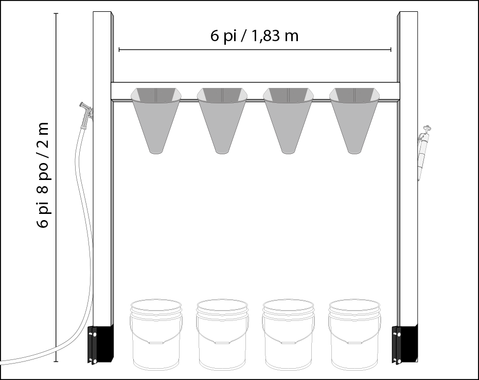 - Une chaudière de plastique de 20 litres placée sous chaque cônes d’abattage pour récupérer le sang (4);
