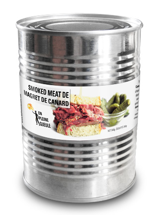 Fruit de la rencontre entre la poitrine de canard gavé du Québec et le vénérable smoked meat montréalais, chaque conserve contient un magret entier, mis en saumure pendant deux jours, épicé dans les règles de l'art puis confit sous-vide dans son bouillon.